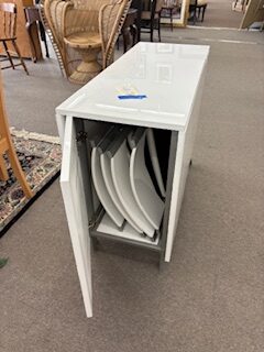 Space Saving Drop Leaf Desk and Chair #HU1EDT$248.00Product HighlightsDrop-leaf desk in white laminate stows its own desk chairs inside, where it practically disappears. When folded it's the size…