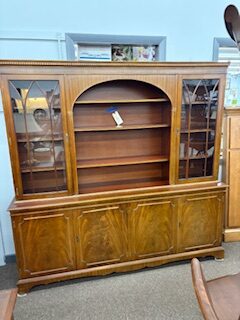 Flame mahogany, glass doors, arched top and tons of storage are just some of the features of this lovely piece. Use as bar, for china, in a library. You name it.